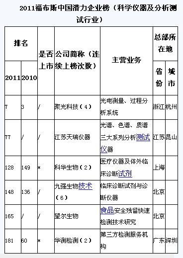 2011年1月10日,《福布斯》中文版在上海發(fā)布其年度首份榜單——2011中國潛力企業(yè)榜,聚光科技、江蘇天瑞儀器、望爾生物、華測(cè)檢測(cè)等多家科學(xué)儀器及分析測(cè)試行業(yè)企業(yè)入選“2011福布斯中國潛力企業(yè)榜”。