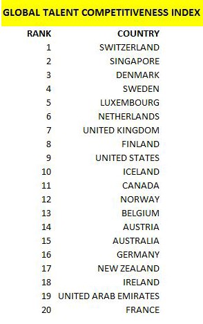 《全球人才競(jìng)爭(zhēng)力指數(shù)》(the Global Talent Competitiveness Index)針對(duì)全球 103 個(gè)國(guó)家,涵蓋人口占世界人口 86.3%。研究顯示,瑞士排行榜首,新加坡獲得第二名,丹麥獲得第三名。亞洲國(guó)家中,日本排列第21名,韓國(guó)第28名。盡管中國(guó)是全球第二個(gè)最重要的經(jīng)濟(jì)體,卻排行第47名。