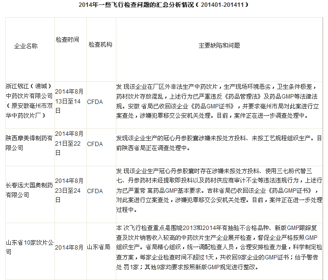 進(jìn)入11月份開始,CFDA的飛行檢查力度和密度更大,監(jiān)管趨勢更嚴(yán)厲。筆者根據(jù)CFDA網(wǎng)站和各省局網(wǎng)站公布的相關(guān)信息,匯總2014年度的飛行檢查情況如下: