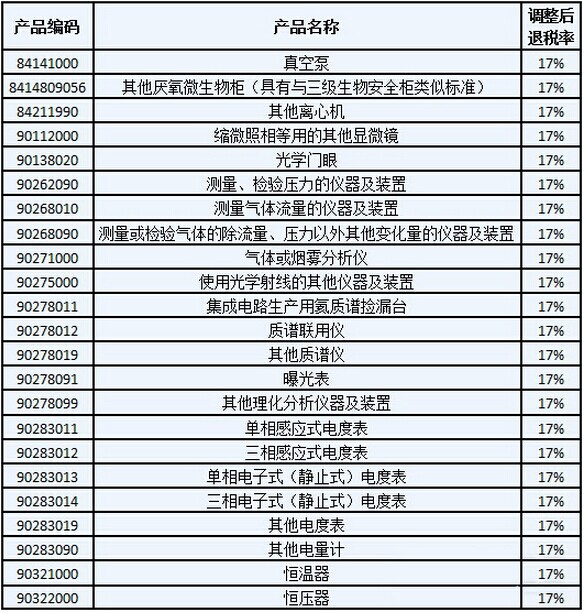 經(jīng)國務(wù)院批準,近日,財政部發(fā)布關(guān)于提高機電、成品油等產(chǎn)品出口退稅率的通知,其中包括了真空泵、質(zhì)譜聯(lián)用儀等實驗室設(shè)備。本次通知提到,將一系列產(chǎn)品的增值稅出口退稅率提高至17%,該通知自2016年11月1日起執(zhí)行。